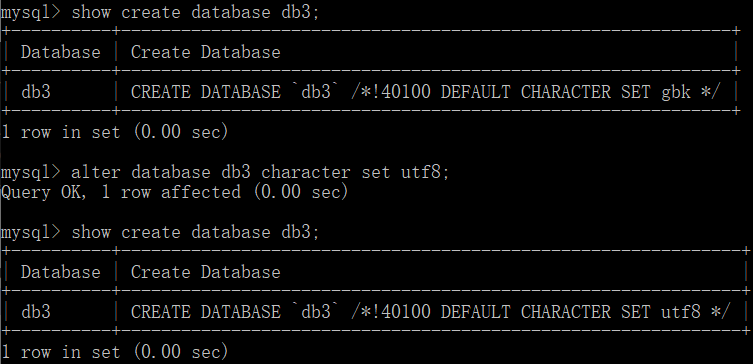 1. 修改字符集类型:alter database db3 character set utf8;,注意这里utf8没有-