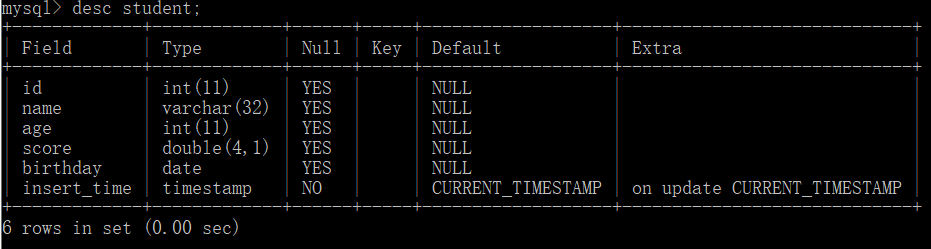 create table student( id int, name varchar(32), age int, score double(4,1), birthday date, insert_time timestamp );