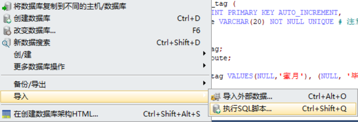 create database db1; use db1; source d://a.sql;